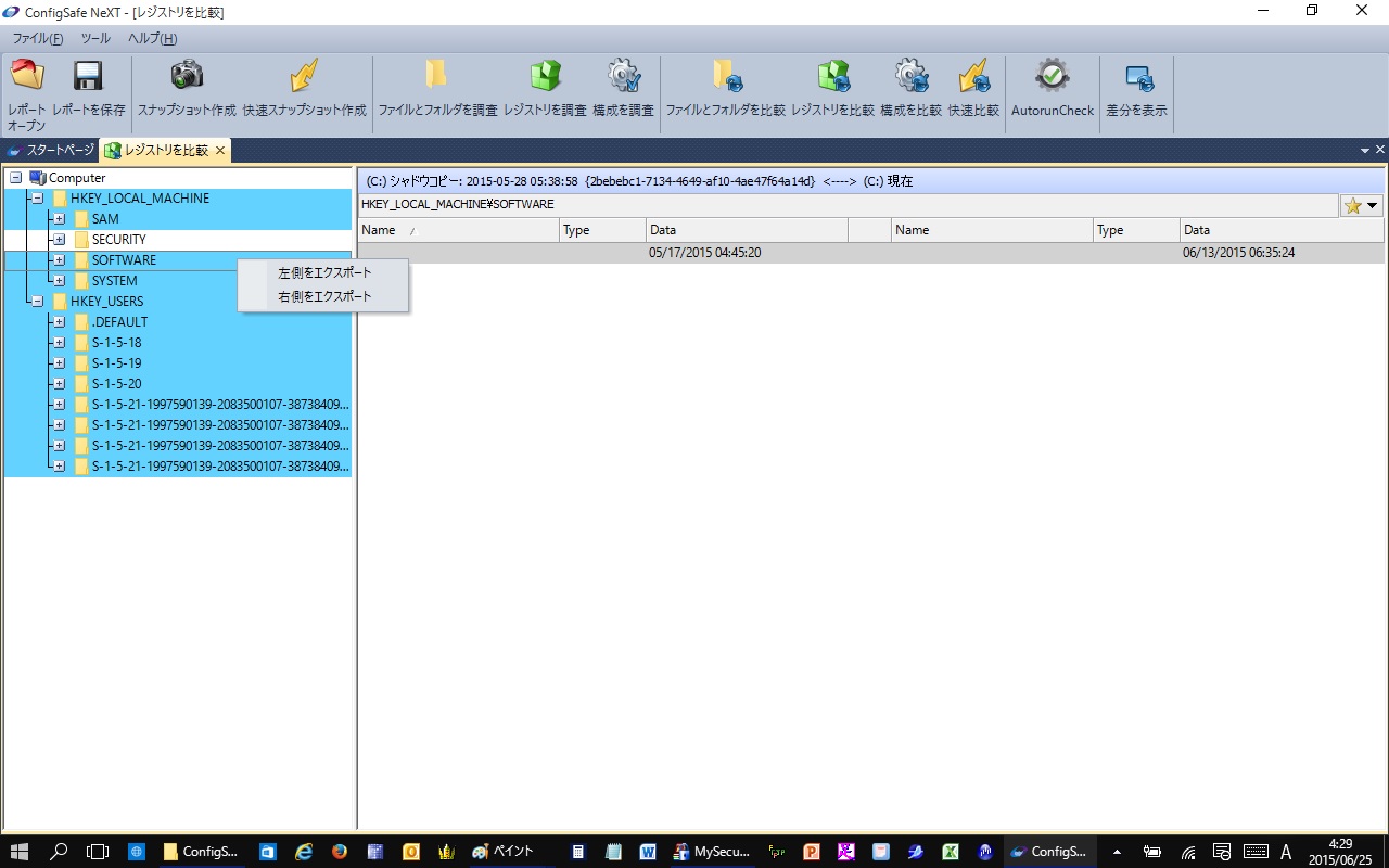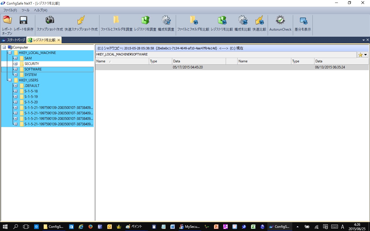 注意:比較処理はレジストリデータの容量、ドライブ速度、ディスクの断片化の割合等によってレポート出力までの時間が異なります。処理が完了すると変更が加えられたレジストリはブルーでハイライト表示されます。