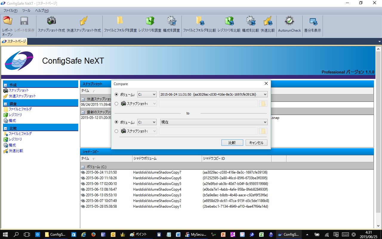 レジストリの比較機能 は、2種類のスナップショット、シャドーコピー、または現在稼働中のライブシステム間のレジストリ内容を直接比較しレポートします。スタートページの比較配下のレジストリを選択して開始します。または、ファイルメニューから比較--->レジストリを選択するか、ツールバーからレジストリーを比較を選択して開始することができます。