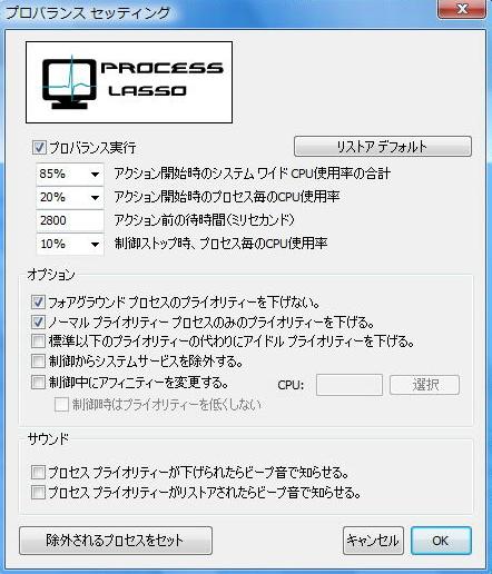 | オプション / プロバランス セッティング / 通常以外のプライオリティーのプロセスを除外 | このオプションは、非正常な優先権のプロセスをプロバランス調整に含まないようにするか否かを指定します。 デフォルト値はONです。 |