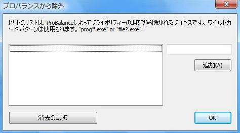 | オプション / プロバランス セッティング / 除外するプロセスを構成 | 本オプションはプロバランス プライオリティー調整から除外するプロセスを定義することができます。 ここに定義されるいかなるプロセスも、プロバランスによってプライオリティーが下げられることはありません。 ワイルドカードも使用することができます。また、プロセスは参照されたプロセスリスト上でマウスの右クリックによって追加、消去できます。 |