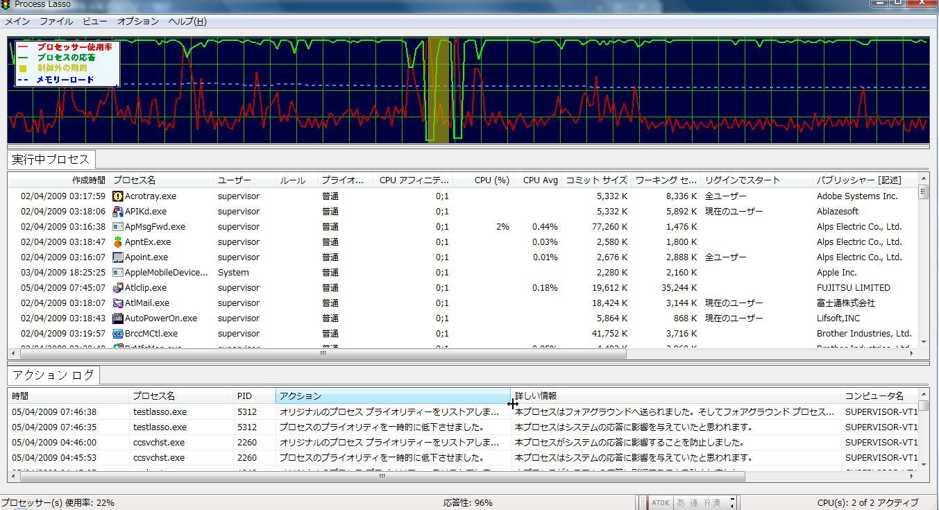 グラフ内で強調される部分は、この間に、Windowsがコントロールできないのプロセス制御が発生し、プロセス ラッソがコントロールを実行したことを表します。これは、プロセス ラッソがいかにシステムの応答性に与える影響の大きいかを見ることができます。 (グラフ内で強調されている部分のタイミングは、非常に近い数値を示していますが、厳密には、多少ずれる場合があります。)