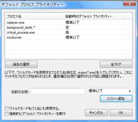 | オプション / デフォルト プライオリティーの構成 ... | プロセスのデフォルト プライオリティー クラスを構成するためのダイアログを呼び出します。 ワイルドカードもサポートされています。プロセス リスト ビューからプロセスを右クリックすることにより、プロセスの デフォルト プライオリティー クラスを設定できます。 |