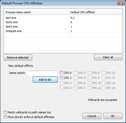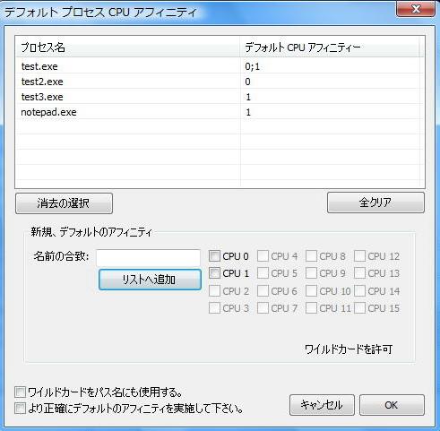 | オプション / デフォルト CPU アフィニティーの構成 .... | プロセスのデフォルト CPU アフィニティーを構成するためのダイアログを呼び出します。 CPUアフィニティーは、プロセスが実行を許可されるCPUの選択が許可されます。ワイルドカードもサポートされています。 プロセス リスト ビューからプロセスを右クリックすることにより、プロセスの CPU アフィニティーを設定できます。 |