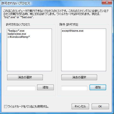 | オプション / 許可しないプロセスの構成 ... | 本設定は、実行が確認された時に自動的にそのプロセスを中断するための、プロセスを選択するためのダイアログを呼び出します。 ワイルドカードもサポートされています。 プロセス リスト ビューからプロセスを右クリックすることにより、このリストへプロセスを追加することができます。 |