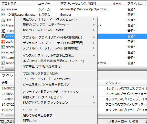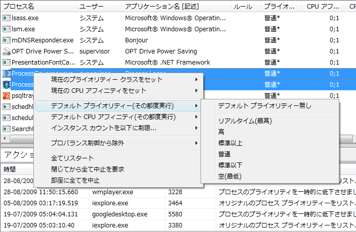 プロセスリストは、実行されているプロセスを参照することができ、また、このリストには簡単なルールがあります。 特定、または複数のプロセス上でマウスを右クリックすると状況に応じた使用可能なオプション メニューが表示されます。 多くのオプショには、現在のプライオリティーとアフェニティーのセッティングだけではなく、これらのデフォルト値の作成も含まれています。 複数のプロセス選択時は、特定のプロセスを選択した時と、コンテクスト メニュー内容が異なっています。 (複数のプロセスで共通で実行できるメニューに変更され表示されます。)