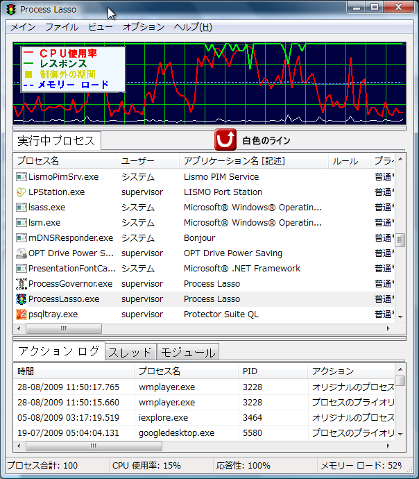メインウインドウは、CPU使用率とシステムの応答性(レスポンス)等に関するグラフ、 実行中のプロセス リスト、プロセス ラッソが実行したアクションのログが表示されます。 プロセス ラッソのコンフィグレーションは、メインメニューから簡単に応用できます。 メインメニュー内に、一般的な全てのコンフィグレーション オプションが含まれています。 特定のプロセス、または複数のプロセス上でマウスを右クリックすると、そのプロセスで 可能なオペレーションを参照できます。