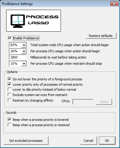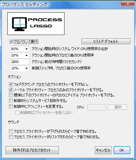 プロセス ラッソのすばらしい特徴の1つに、デフォルト プライオリティーとアフィニティーを手動で調整し、システムの動作をご自身で設定できる点があります。 プロバランスは自動的にあなたのシステムの反応性を改良するすばらしい方法ですが、あなたがさらに応用した使用法を望んでいるなら、 プロセス ラッソはあなたのシステムが動作する環境を大きく完全するパワーを持っています。 プロバランスは自動的にあなたのシステムの反応性を改良するすばらしい方法ですが、あなたがさらに多くの応用を望んでいるなら、 あなたはプロセス ラッソからその方法を得ることができるでしょう。