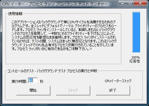 プロセス ラッソをインストールしたら、プロバランス機能をONにした場合と、OFFにした場合で、CPUイーターを実行し、あなたのシステムの反応速度を比較して下さい。プロバランス